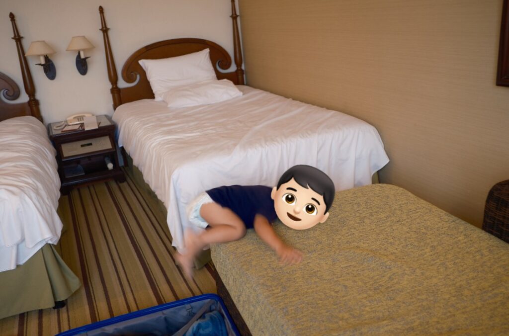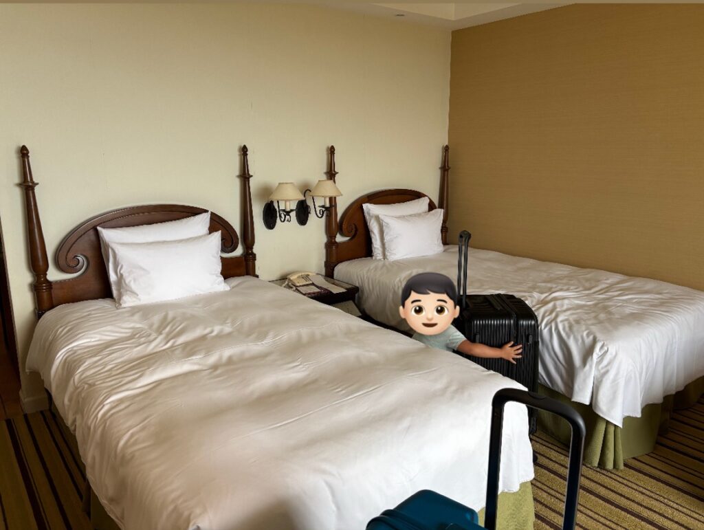 予約の際に「2つのベッドをくっつけって」と書き忘れ・・・😭でも、奥のベッドが壁に付いていたので息子を壁側に。その隣で私が寝る配置にしました。