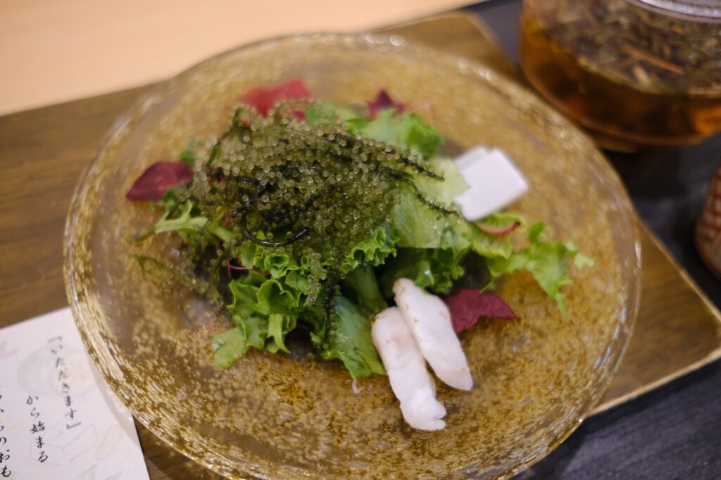 お造り(イカ・マグロ・白身魚)と沖縄野菜のサラダ。海ぶどう添え