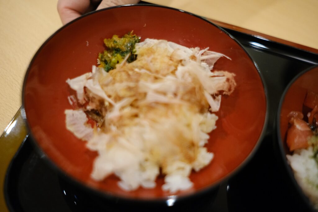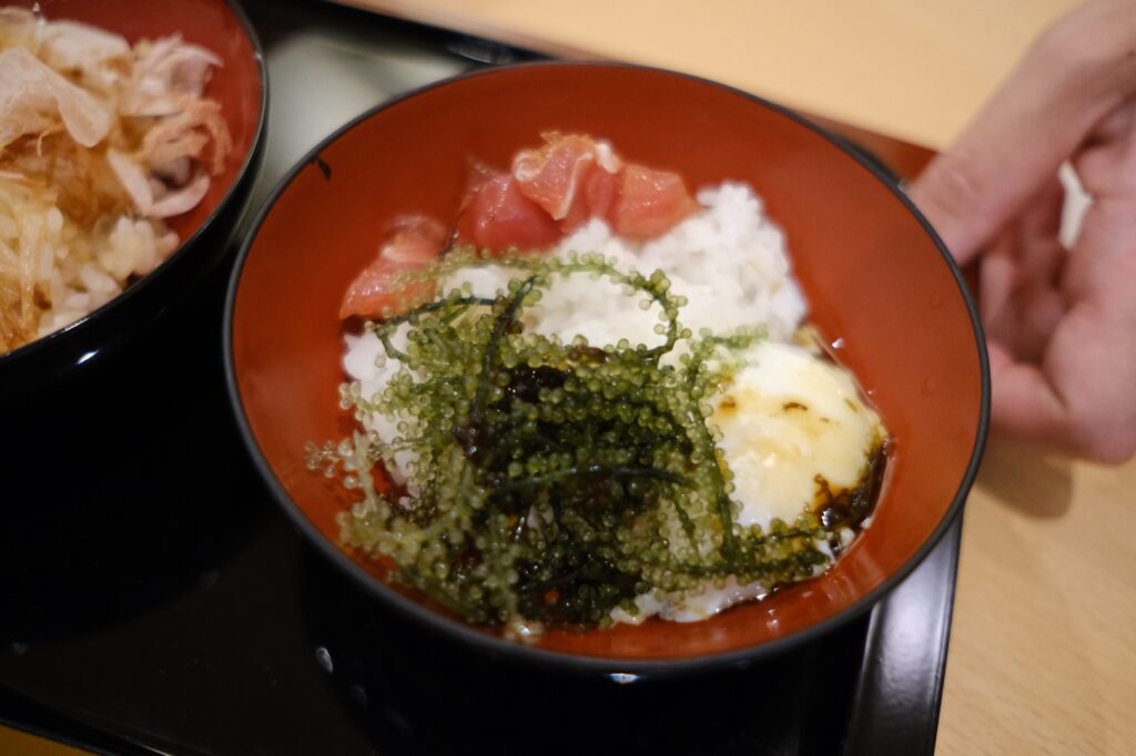 ご飯はマグロや海ぶどうなどをのせて海鮮丼にもできます!スタッフさんが常駐しているのでお願いして作ってもらうスタイルです。