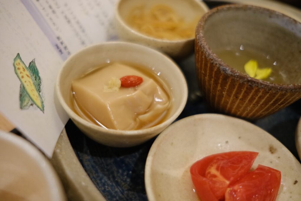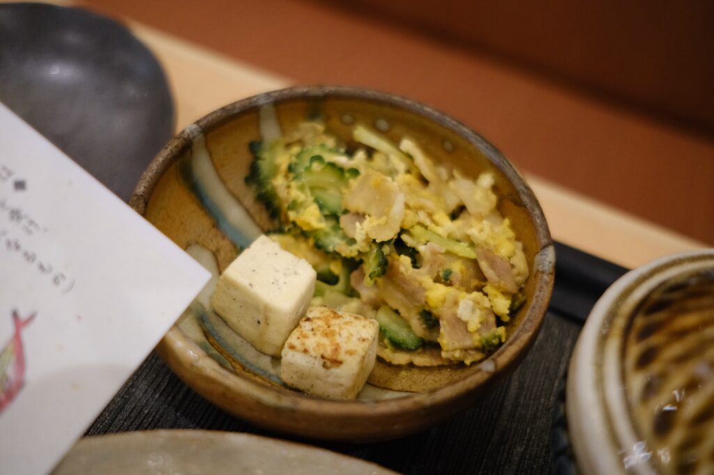 やちむんの小鉢に盛り付けされた沖縄料理たち。宝石箱のような御膳✨