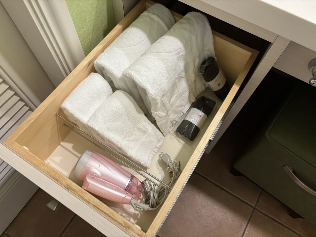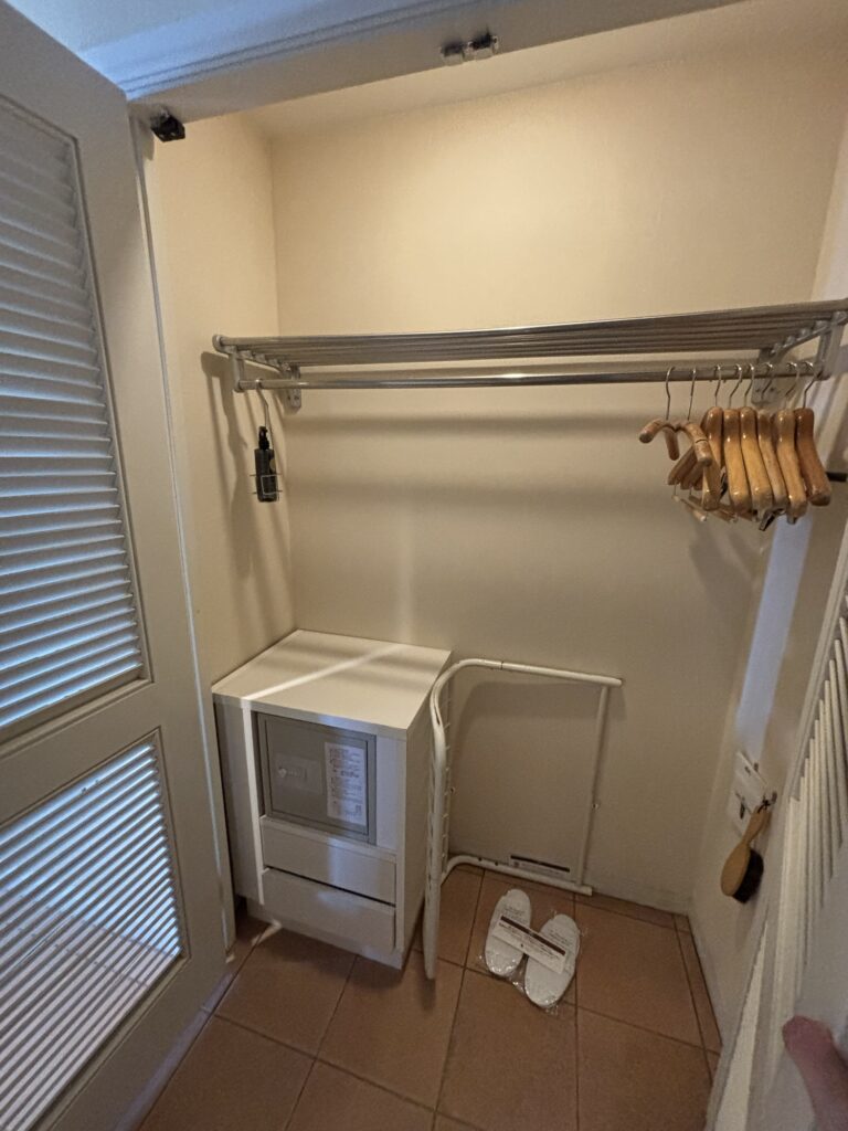 あとは、クローゼットや金庫、姿見。写真を撮り忘れてしまったんですが、もちろんコーヒーやお水、冷蔵庫などのドリンクブースもありました。