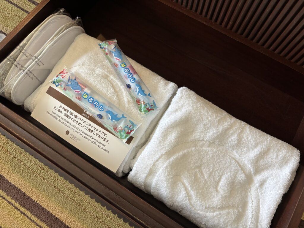 TV台の引き出しにはパジャマとバスタオル。そして息子用の歯ブラシも入っていました🪥