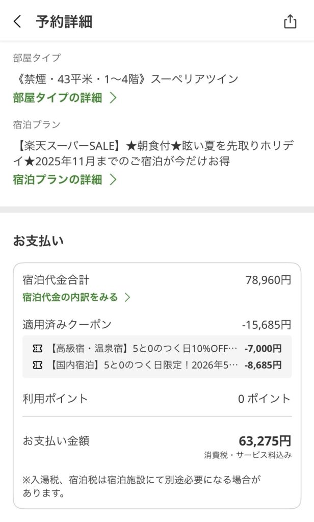 予約した時は楽天スーパーセールを実施していて、クーポン利用して15000円ほど安くなりました♪